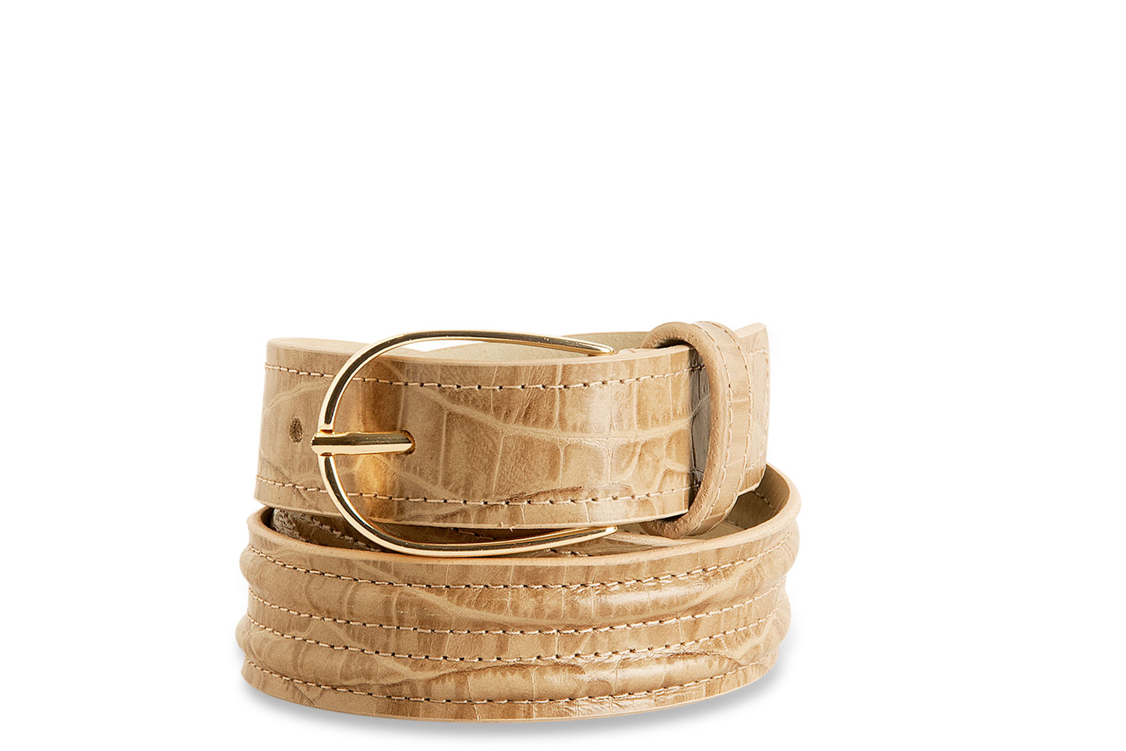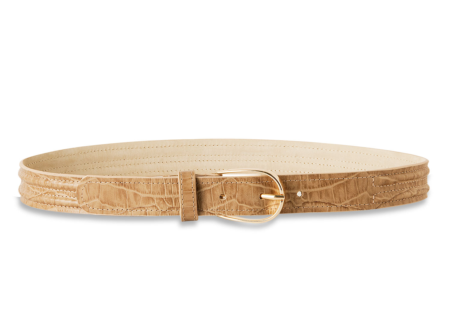 Com medida pensada para passantes de calça e fivela discreta à primeira vista, ele revela detalhes que faz a diferença: o couro em estampa croco com leve brilho, o volume sutil e estratégico ao longo do cinto, o acabamento com borda italiana e a fivela espessa , importante quando observada de perfil.